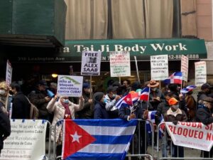 “Dejen vivir a Cuba”, “Levanten el bloqueo”, “Cuba sí, bloqueo no” corearon los activistas congregados en una céntrica esquina de la ciudad de Nueva York, en la Avenida Lexington.