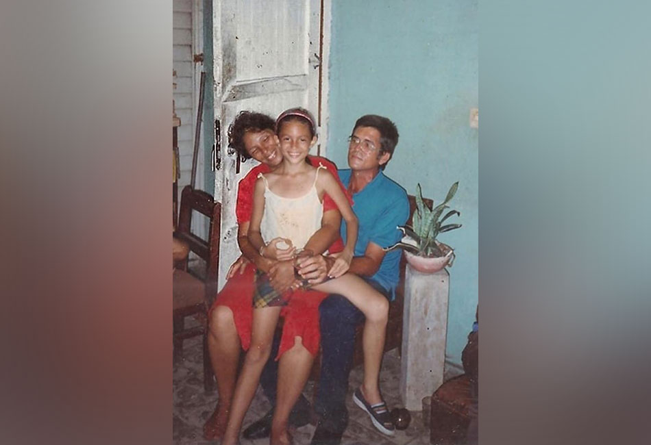 La foto es en nuestro apartamento en el Distrito José Martí, en Santiago de Cuba. Atrás la puerta remendada y llevo puestos los únicos zapatos que tenía en aquel momento a los que mi mamá les puso un parche de arcoiris en la punta para tapar el hueco. / Foto tomada del perfil en Facebook de la autora