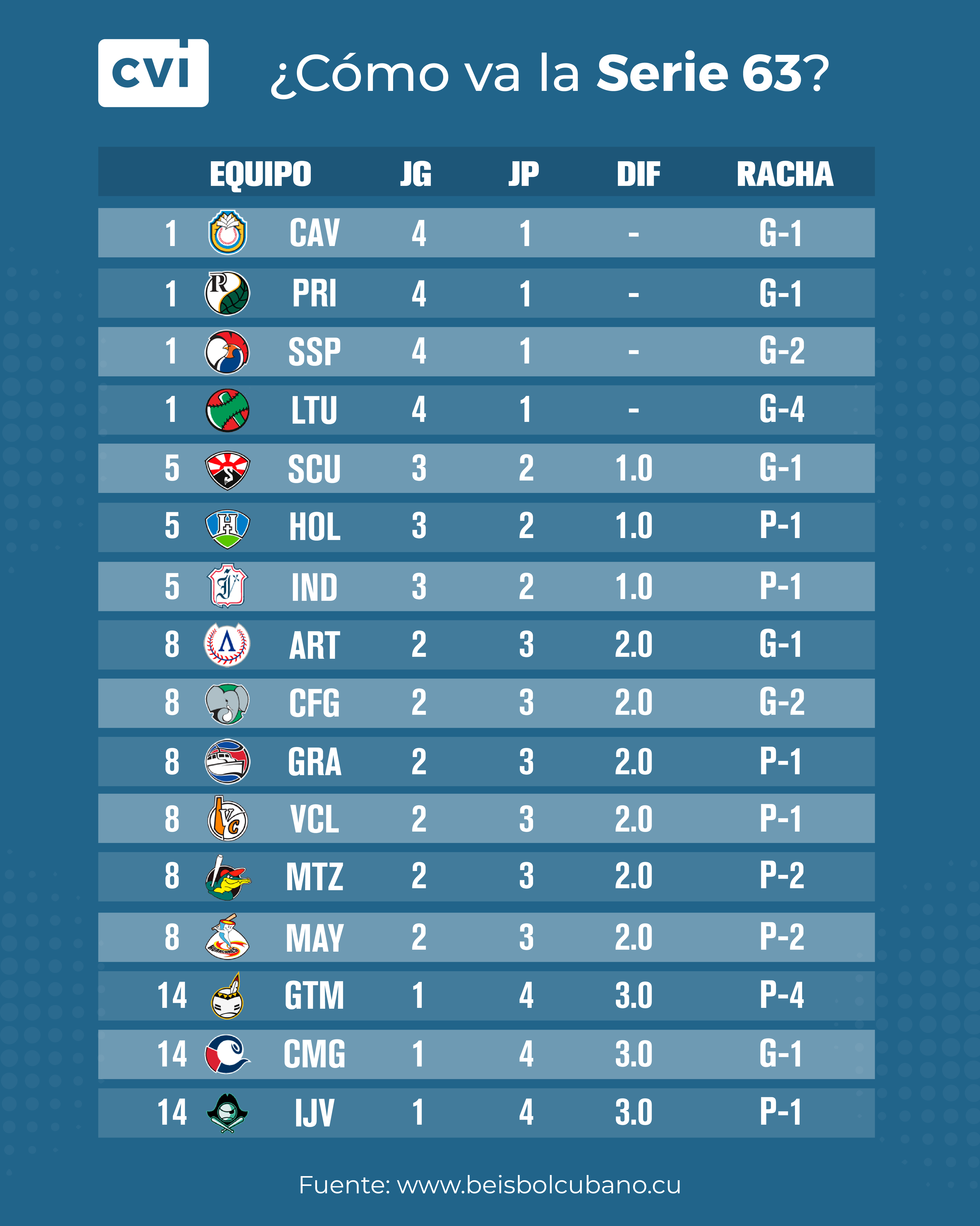 Cuatro equipos comandan la tabla de posiciones con una sola derrota. Ciego de Ávila, Pinar del Río, Sancti Spíritus y Las Tunas son los líderes. De este grupo sorprenden los Tigres, que no partían como favoritos para muchos. Los Vegueros y los Gallos cuentan con buenos cuerpos de lanzadores, mientras que los Leñadores barrieron a Guantánamo en tres pleitos muy cerrados.