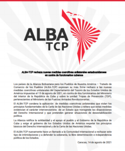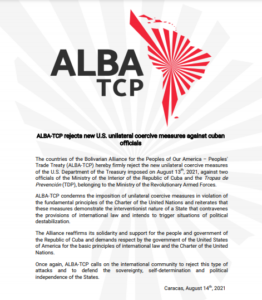 La Alianza Bolivariana para los pueblos de Nuestra América-Tratado de Comercio de los Pueblos (ALBA-TCP) condenó este sábado la imposición de nuevas medidas unilaterales de Estados Unidos contra funcionarios cubanos.