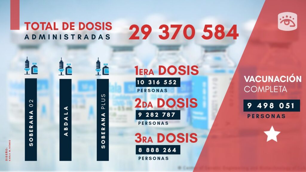 El esquema completo alcanzó a nueve millones 498 mil 51 personas, lo cual representa el 84,9 por ciento de los habitantes de la isla caribeña (11,3 millones), precisó el Ministerio de Salud (Minsap) con datos del cierre 19 de este mes.