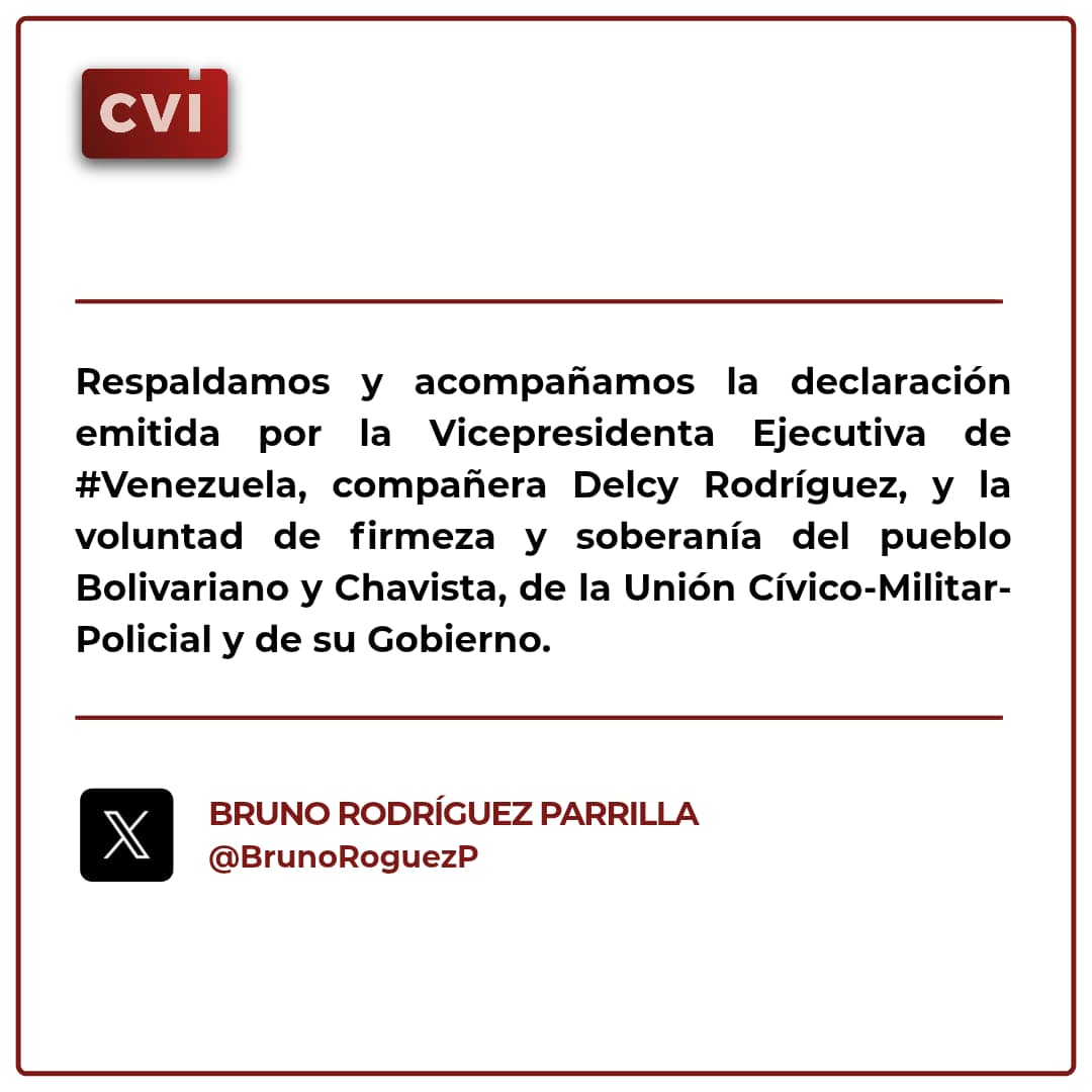 Por medio de X, el Jefe de la diplomacia cubana expresó la voluntad de firmeza y soberanía del pueblo Bolivariano y Chavista, de la Unión Cívico-Militar-Policial y de su Gobierno.