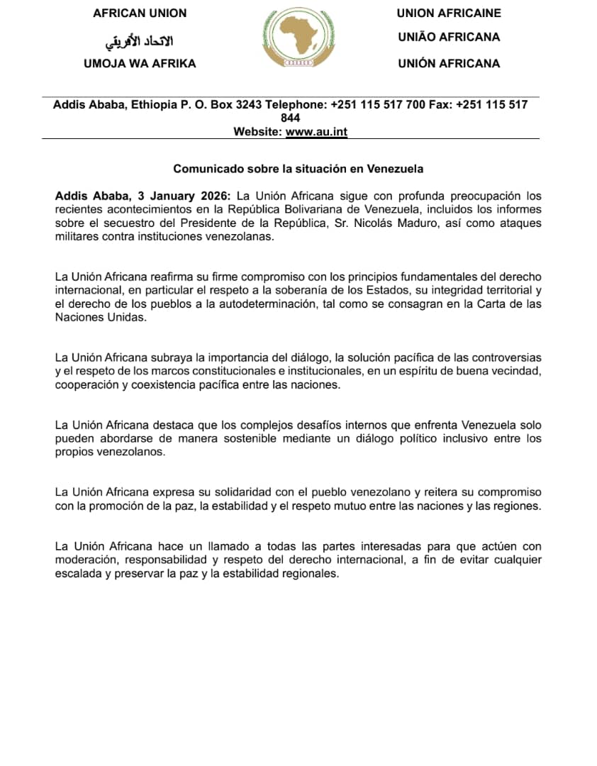 La Unión Africana expresa su solidaridad con el pueblo venezolano y reitera su compromiso con la promoción de la paz, la estabilidad y el respeto mutuo entre las naciones y las regiones.