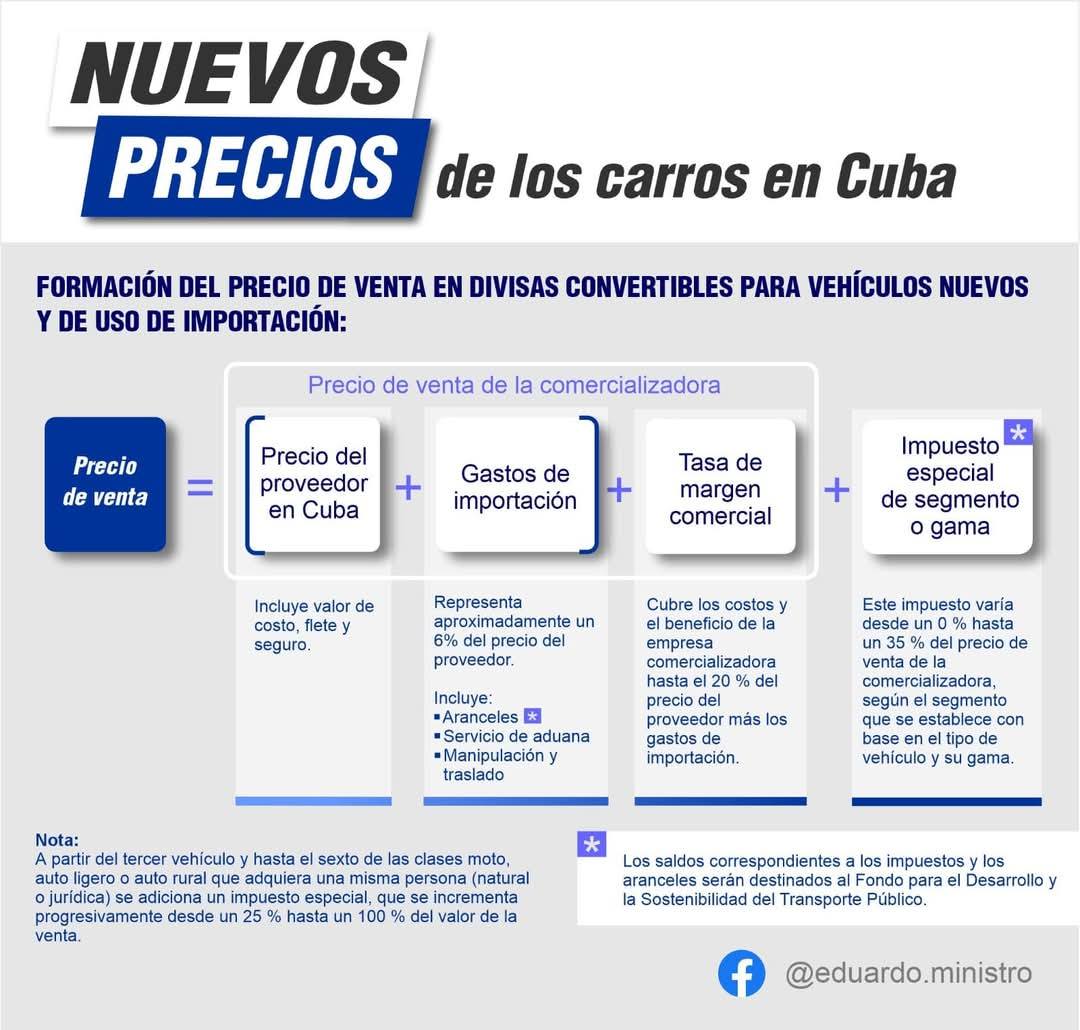 • Impuesto especial ajustado: Este variará desde un 35 % del valor total de la venta en divisas convertibles para vehículos de gama alta, hasta no aplicarse a vehículos eléctricos ensamblados en Cuba.