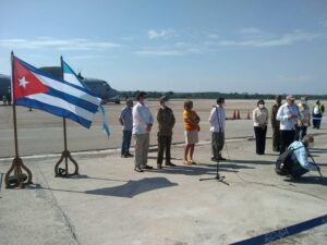 Al recibimiento del vuelo acudieron también el general de brigada Antonio Curbelo, jefe de la Defensa Antiaérea de las Fuerzas Armadas Revolucionarias cubanas, y Jorge Mayo, director de América del Sur de la Cancillería, entre otros representantes gubernamentales y militares.
