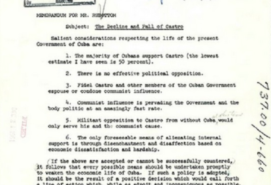 El 6 de abril de 1960, el vice secretario de Estado Asistente para los Asuntos Interamericanos, Lester D. Mallory, en un memorando secreto, definió la filosofía del bloqueo económico, comercial y financiero impuesto poco después contra la nación antillana.