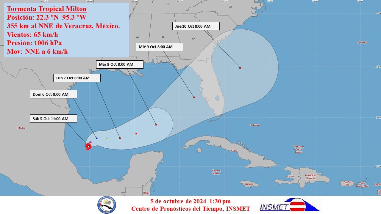 Milton se mueve con un rumbo próximo al norte nordeste con una velocidad de traslación de 6 kilómetros por hora. En las próximas 12 a 24 horas este sistema se mantendrá con similar movimiento, ganando algo más en organización e intensidad, con posibilidad de convertirse en un huracán en los próximos días.