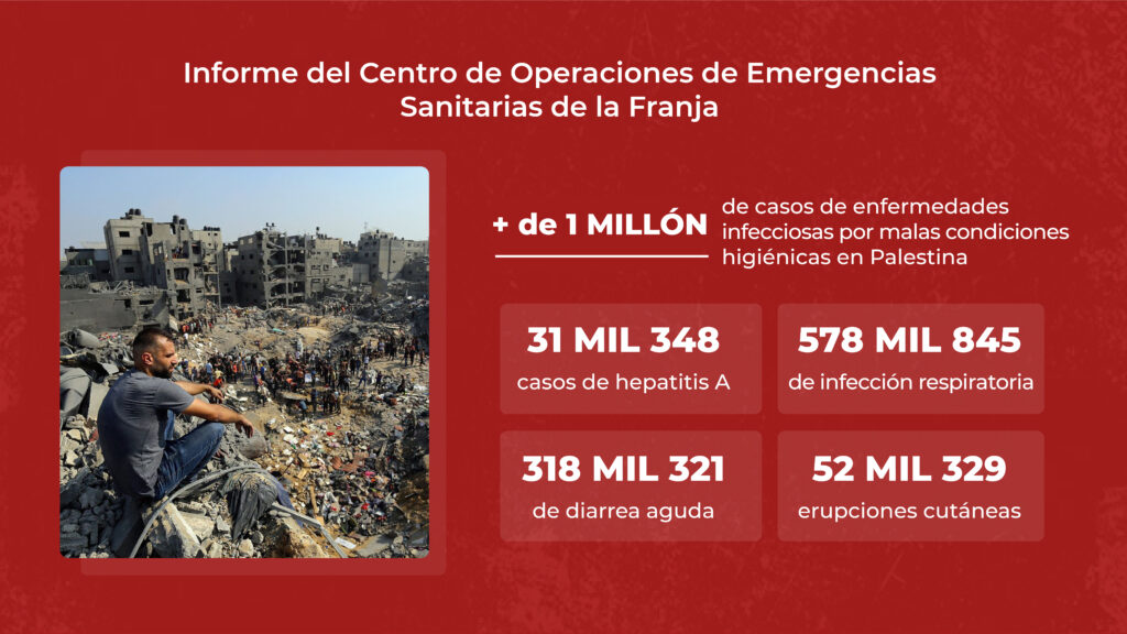 Pero esto no es todo: Se registran más de 47 mil casos de piojos, 35 mil 336 de sarna y unos 7 mil 643 residentes en la zona hoy padecen de Viruela. Los números hablan por sí solos y como si esto fuera poco las tropas invasoras de Israel impiden el acceso de ayuda humanitaria a Gaza, lo que hace más precaria la situación de los que permanecen allí.