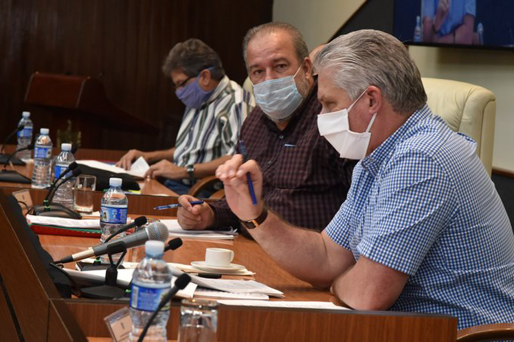 Díaz-Canel llamó a la información oportuna a los familiares que tienen a algunos de sus miembros en los centros de aislamiento y también sobre el suministro de las gotas homeopáticas de Prevengho-Vir, entre otros temas.