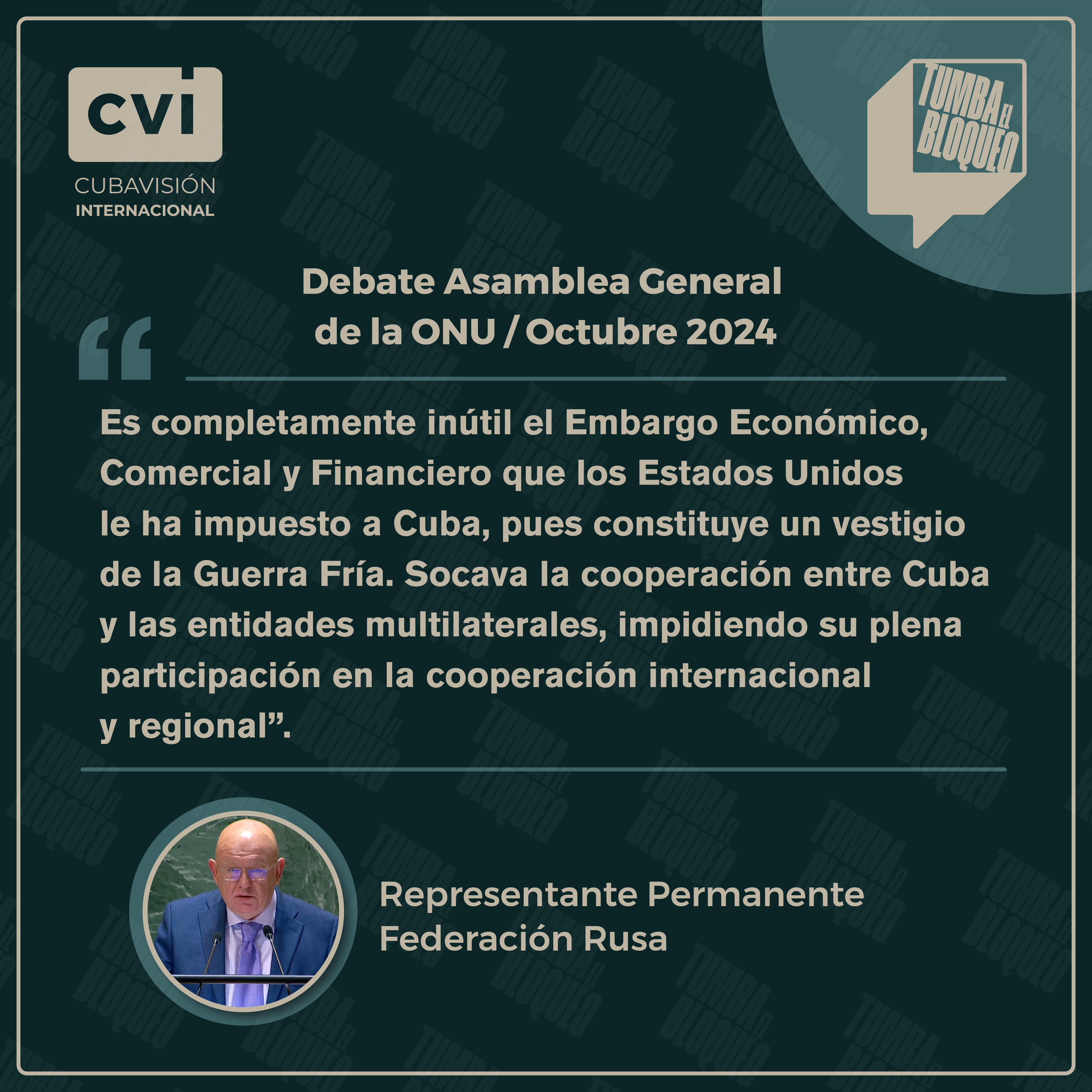 «Reiteramos nuestra posición en cuanto a que el bloqueo debe ser finalizado con celeridad. Mantenemos la firme posición de que se debería brindar a Cuba el apoyo y la cooperación necesarios para que el país pueda superar sus desafíos en materia de desarrollo, esto junto al levantamiento del bloqueo ayudaría a Cuba».