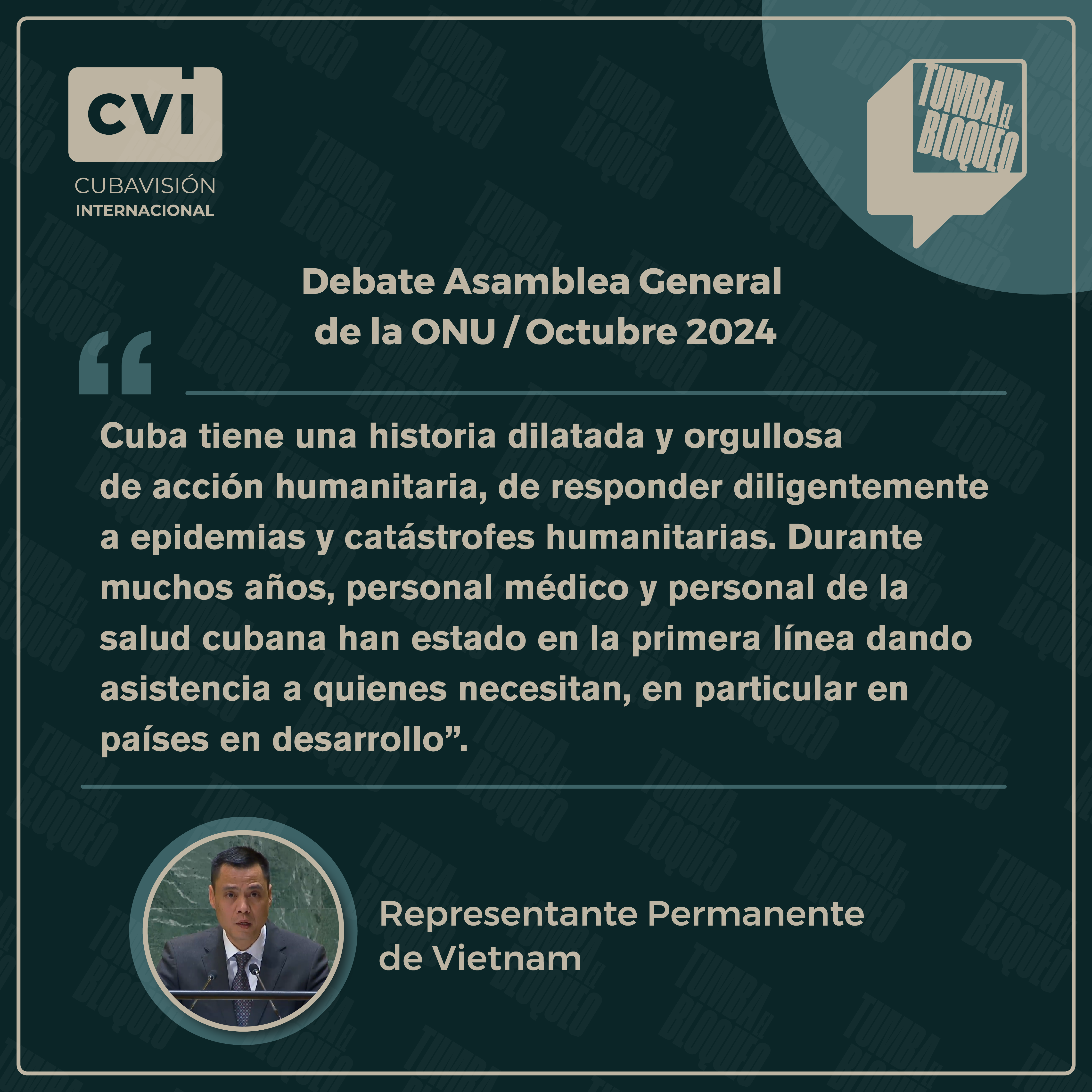«Cuba tiene una historia dilatada y orgullosa de acción humanitaria, de responder diligentemente a epidemias y catástrofes humanitarias. Durante muchos años, personal médico y personal de la salud cubana han estado en la primera línea dando asistencia a quienes necesitan, en particular en países en desarrollo».