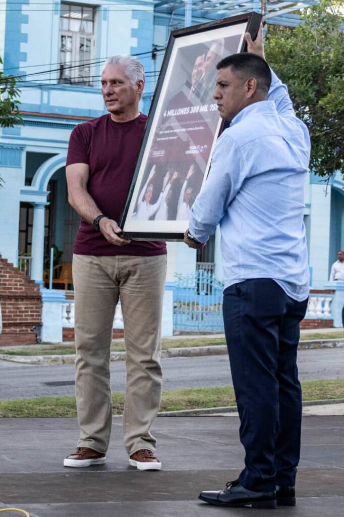 Díaz-Canel entregó a Pedro Infante Aparicio, primer vicepresidente de la Asamblea Nacional de Venezuela, un cuadro y copia del Libro de Firmas en apoyo a la Revolución Bolivariana, encabezado por la rúbrica del General de Ejército Raúl Castro Ruz, líder de la Revolución cubana, junto a cuatro millones 338 mil cubanos, los cuales encarnan también la forma simbólica del Comandante en Jefe Fidel Castro Ruz.