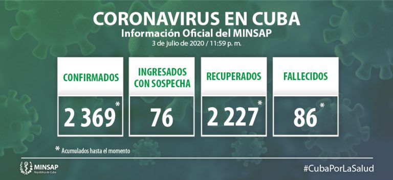 De los 2 mil 369 pacientes diagnosticados con la enfermedad, se mantienen ingresados confirmados 54 (2,28%), de ellos 52 (96,3%) con evolución clínica estable. Se acumulan 86 fallecidos (ninguno en el día), dos evacuados y 2 mil 227 pacientes recuperados (94,1%) (3 en el día de ayer). No se reportan pacientes en estado crítico y 2 en estado grave.
