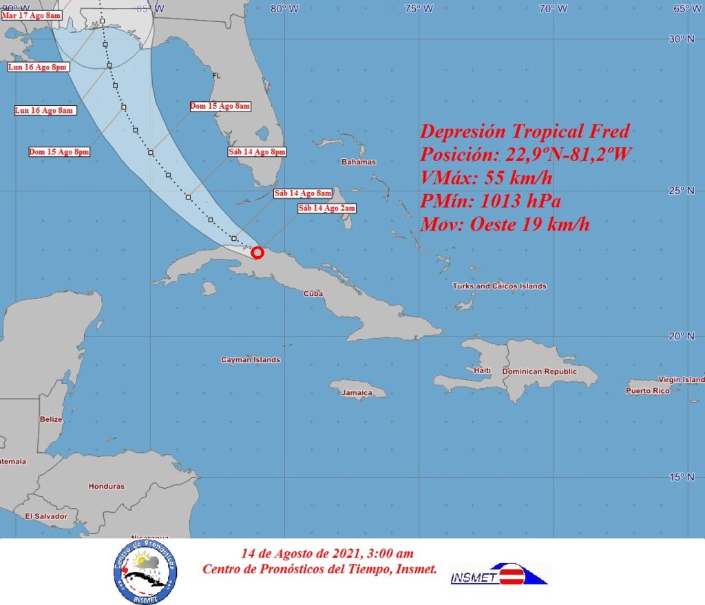 En el aviso de ciclón tropical No. 22, a las seis de la mañana, las autoridades meteorológicas cubanas dfinieron que el centro pobremente definido de la depresión tropical Fred, se estimó en los 23.4 grados de latitud Norte y los 81.9 grados de longitud Oeste, posición que lo sitúa a 80 kilómetros al oeste noroeste de Cárdenas, Matanzas y a 22 kilómetros al norte de Santa Cruz Norte, Mayabeque.