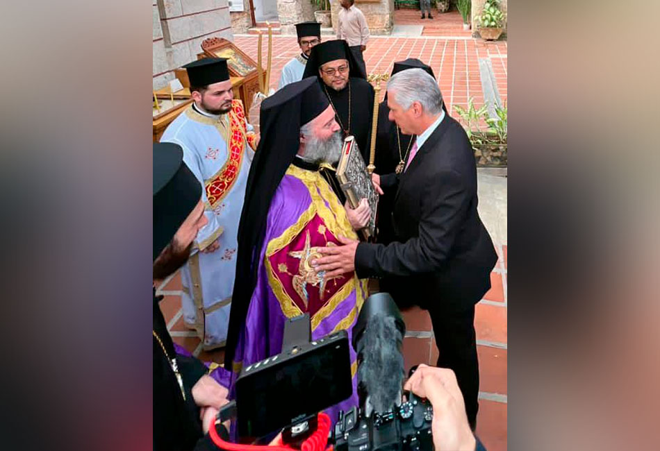 En la Sacra Catedral Ortodoxa Griega San Nicolás de Myra, consagrada hace dos décadas en el Centro Histórico habanero, el mandatario cubano fue recibido por el representante del patriarcado ecuménico de visita en la mayor de las Antillas, el arzobispo de Australia, Monseñor Makarios.