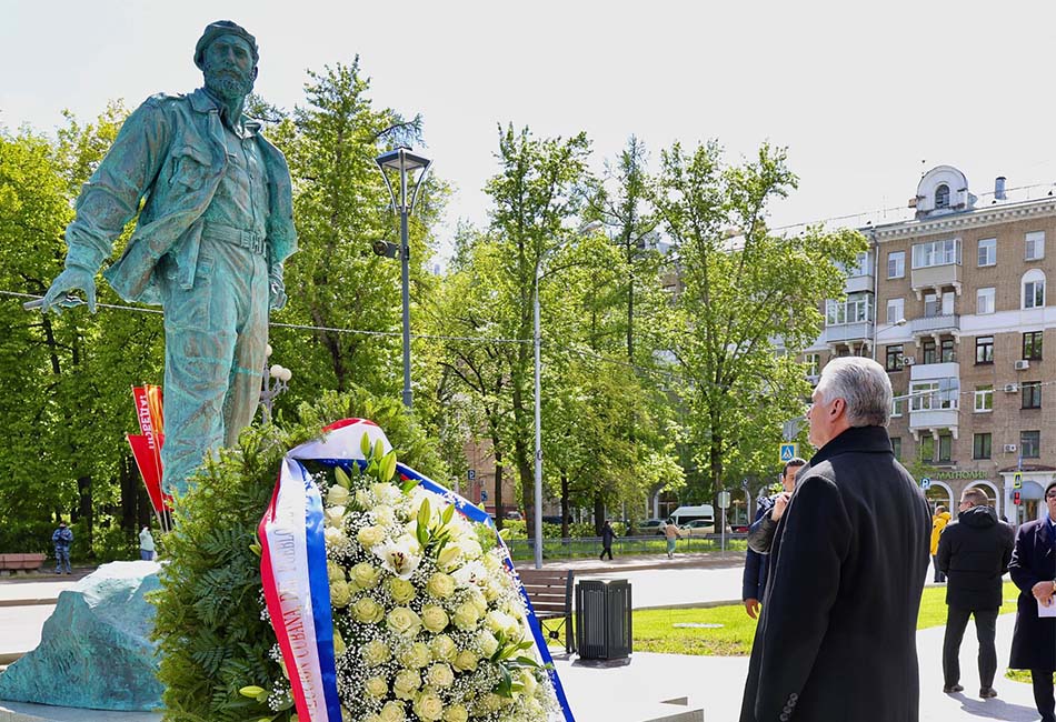 Hasta el distrito de Sokol, en la capital rusa, llegó el jefe de Estado de la nación caribeña con la delegación que lo acompaña en su visita de trabajo al gigante euroasiático para colocar una ofrenda floral al invicto comandante en jefe.