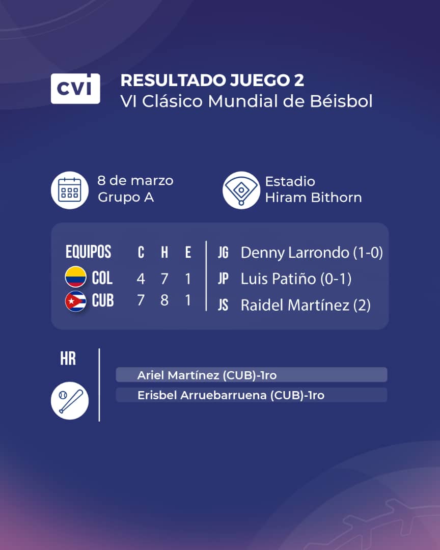 Gracias a los enormes cuadrangulares del «guajiro» Ariel Martínez y el «grillo» Erisbel Arruebarruena –frente a los envíos del abridor Luis Patiño— los antillanos supieron ripostar desde la propia primera entrada.