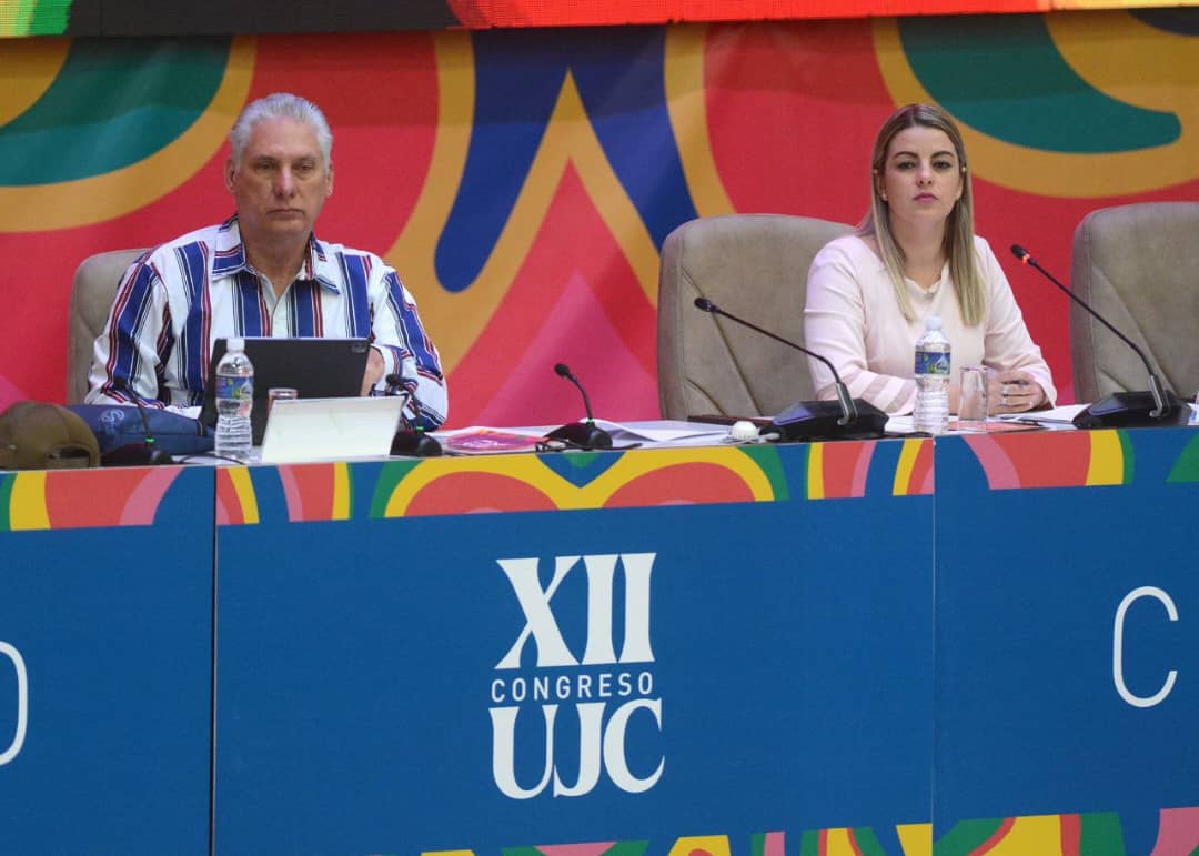 El primer secretario del Partido Comunista de Cuba (PCC) y presidente de la República, Miguel Díaz-Canel Bermúdez, encabeza la sesión de clausura del XII Congreso de la Unión de Jóvenes Comunistas (UJC), en el capitalino Palacio de las Convenciones.