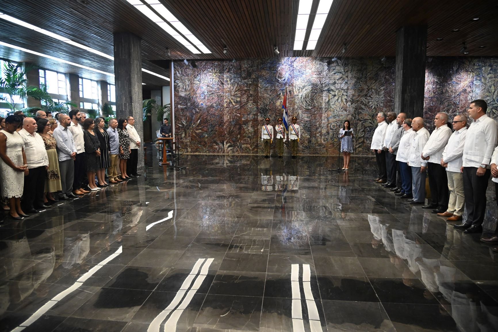 La ceremonia de juramentación de 32 nuevos embajadores que representarán a Cuba en diversas regiones del mundo tuvo lugar en el emblemático salón Portocarrero del Palacio de la Revolución, en La Habana.