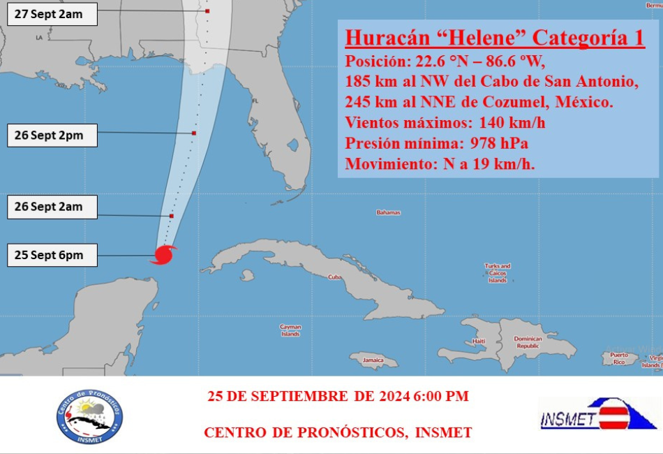 Las lluvias asociadas a Helene han afectado el occidente y centro de Cuba. Según los reportes de la red de estaciones meteorológicas del INSMET, los mayores acumulados durante el día de hoy han sido en Santiago de la Vegas, La Habana con 90 milímetros; Batabanó, Mayabeque con 56 milímetros e Isabel Rubio, Pinar del Río con 44 milímetros.