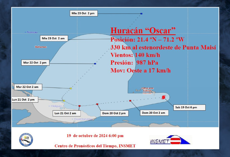 En dependencia de la trayectoria del huracán Oscar, comenzarán a deteriorarse las condiciones del tiempo desde este domingo. Aumentarán gradualmente las áreas de chubascos, lluvias y tormentas eléctricas, las que pueden ser fuertes y localmente intensas en algunas localidades y en las zonas montañosas desde la noche de mañana. Se incrementará gradualmente la fuerza de los vientos en las provincias orientales, las que en la tarde-noche pueden alcanzar velocidades entre 85 y 100 kilómetros por horas, con rachas superiores. Se iniciarán fuertes marejadas al norte de Guantánamo, Holguín y Las Tunas, así como inundaciones costeras en zonas bajas de este litoral, incluyendo el malecón de Baracoa.