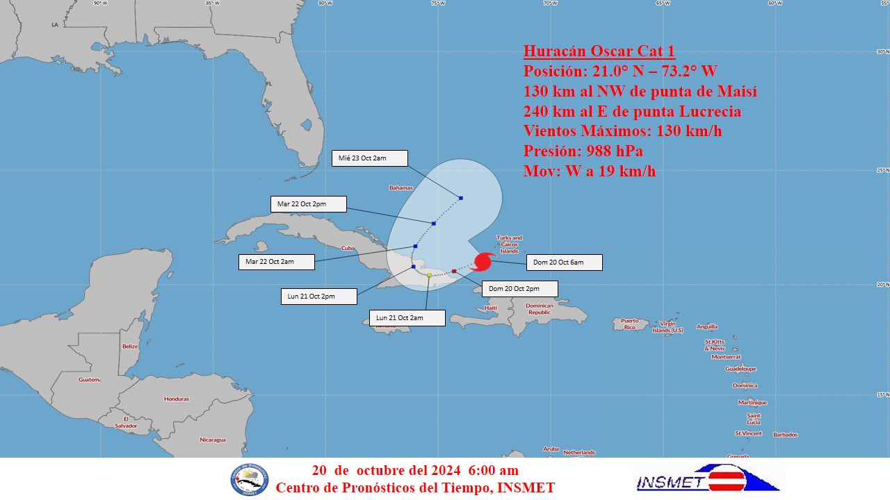En la costa norte oriental se iniciarán fuertes marejadas desde el mediodía de hoy, principalmente al norte de las provincias de Guantánamo, Holguín y Las Tunas, así como inundaciones costeras moderadas en zonas bajas de este litoral, incluyendo el malecón de Baracoa. Debe prestarse la mayor atención en las provincias orientales a la evolución y futura trayectoria del huracán Oscar.