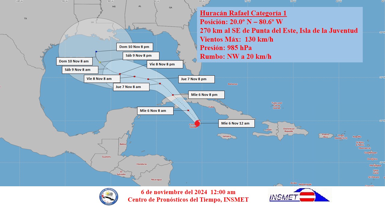 El Centro de Pronósticos del Instituto de Meteorología (INSMET) de Cuba, emitió el aviso de ciclón tropical No. 8 sobre el huracán Rafael, el cual continúa ganando organización e intensidad, con vientos máximos sostenidos que se han incrementado a 130 kilómetros por hora, lo que lo convierte en un huracán de categoría uno en la escala de Saffir-Simpson. Su presión mínima central ha descendido a 985 hectopascals.