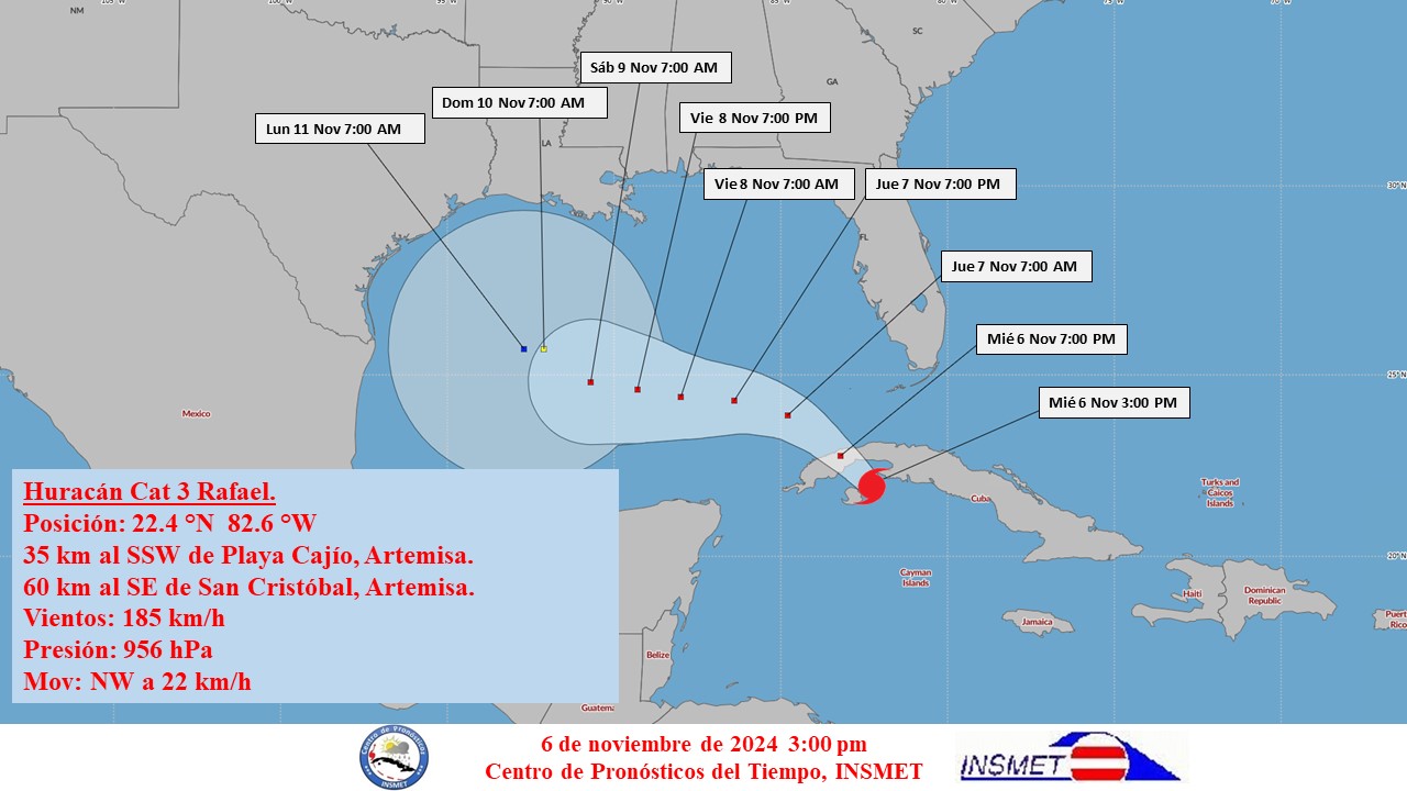A la tres de la tarde el centro del huracán se estimó en los 22.4 grados de latitud Norte y los 82.6 grados de longitud Oeste, posición que lo sitúa a 35 kilómetros al sur-suroeste de playa Cajío y a 60 kilómetros al sudeste de San Cristóbal, ambas localidades en la provincia de Artemisa. Este organismo se ha mantenido durante las últimas horas con un rumbo próximo al noroeste y una velocidad de traslación de 22 kilómetros por hora.