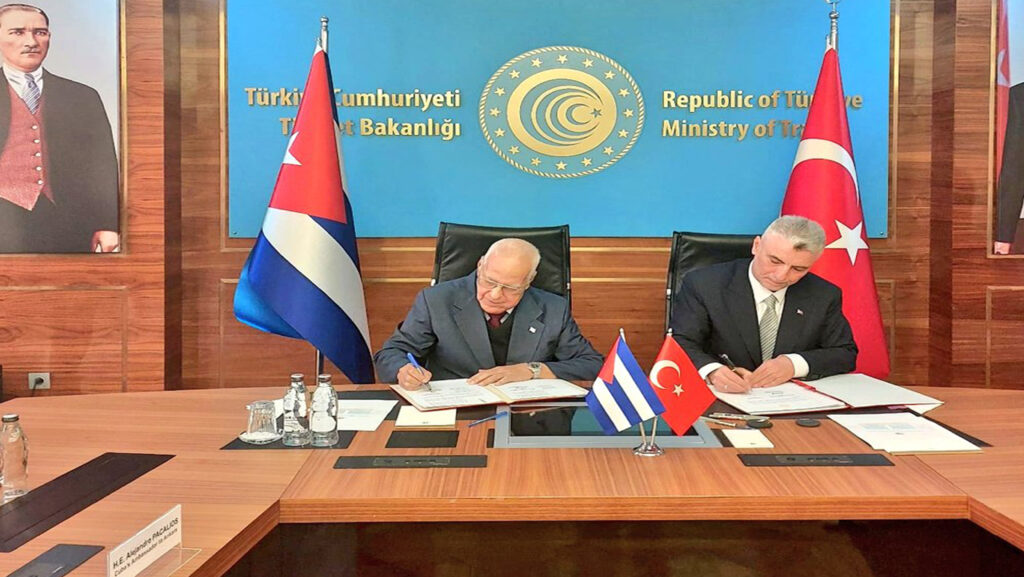 Durante el día de hoy, el vice primer ministro cubano se reunió con los Excmo. Sr. Ömer Bolat, ministro de Comercio, con quien firmó un acuerdo que establece una Agenda Económica bilateral para el período 2024-2026; y con el Excmo. Sr. Hakan Fidan, ministro de Relaciones Exteriores, a quien agradeció el tradicional respaldo de Türkiye a las resoluciones cubanas contra el bloqueo económico, comercial y financiero impuesto por los EE.UU. contra Cuba, en el contexto de la Asamblea General de Naciones Unidas. Ambos titulares estuvieron acompañados de altos directivos de sus respectivas instituciones.