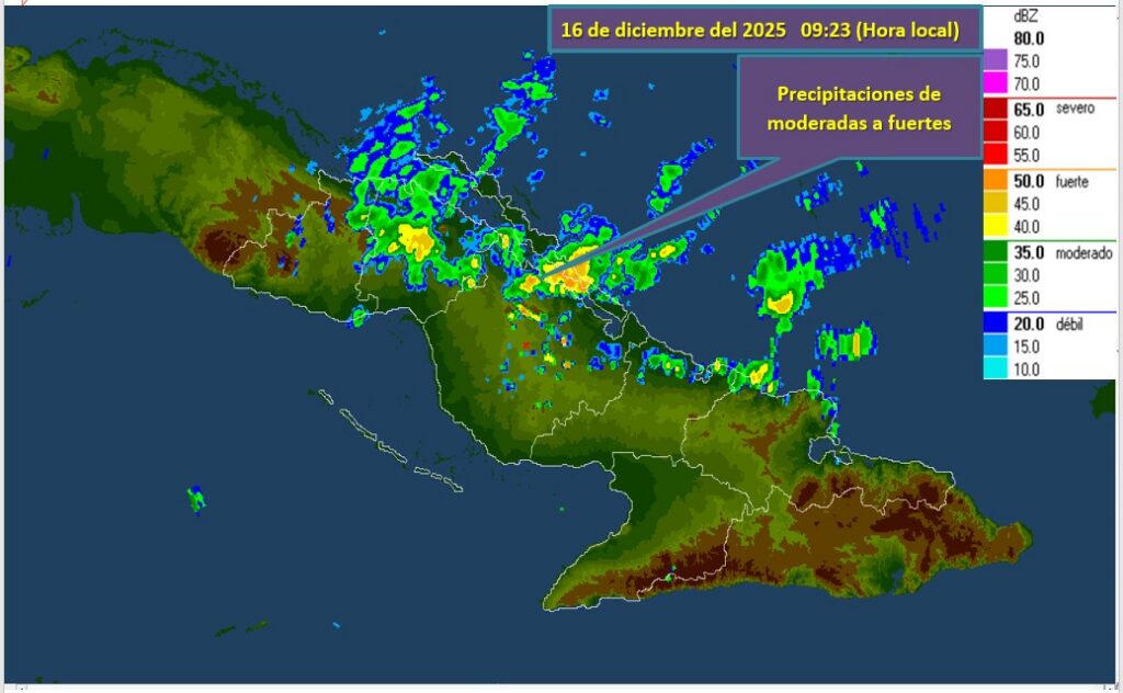 Esta configuración en combinación con los factores a escala local estimuló la ocurrencia de chubascos y lluvias en dichos territorios del país durante la pasada jornada, incluso madrugada y primeras horas de la mañana de hoy.