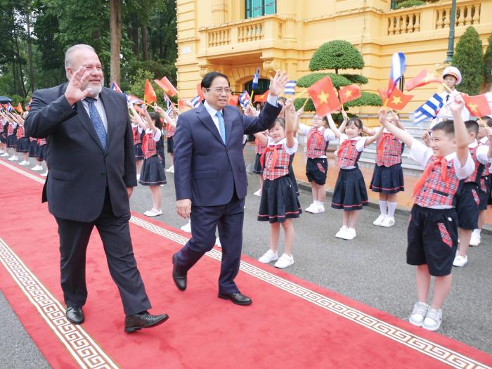 Pham Minh Chinh invitó a su par cubano a pasar revista a la guardia de honor del Ejército Popular de Vietnam y, seguidamente, fueron presentadas las delegaciones de alto nivel. Por la parte cubana, integran la comitiva varios titulares de carteras, la viceministra de Relaciones Exteriores, Josefina Vidal Ferreiro; así como el embajador de Cuba aquí, Orlando Nicolás Hernández Guillén, y el director de Asia y Oceanía de la Cancillería, Alberto Blanco Silva.