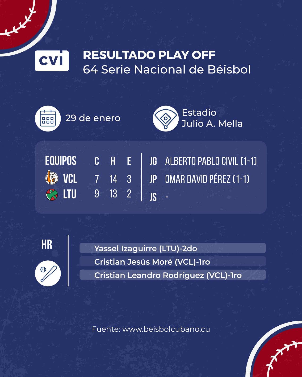 En tanto, Cristian Leandro Rodríguez (5-2), quien igualó las acciones en la séptima entrada con un cuadrangular, Elicer Arrechavaleta (4-3) y Cristian Moré (1-1, 1-HR, 2 CI), fueron los más destacados por la escuadra villaclareña, aunque estos dos últimos abandonaron el encuentro por lesión.