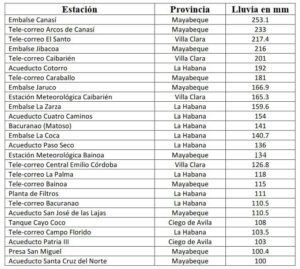 En la red combinada de estaciones meteorológicas y de pluviómetros del Instituto Nacional de Recursos Hidráulicos se registraron acumulados superiores a 100 milímetros en 26 localidades, y en 5 hubo registros por encima de 200 milímetros. Los mayores acumulados se relacionan en la siguiente tabla: