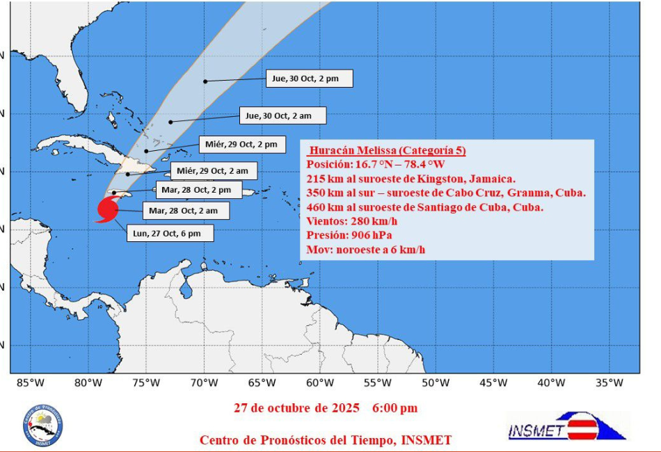 A las seis de la tarde de hoy el ojo del huracán Melissa fue estimado en los 16.7 grados de latitud Norte y los 78.4 grados de longitud Oeste, posición que lo sitúa a unos 215 kilómetros al suroeste de Kingston, Jamaica, a 350 kilómetros al sur-suroeste de Cabo Cruz, Granma y a 460 kilómetros al suroeste de la ciudad de Santiago de Cuba. Melissa se mueve lentamente con un rumbo próximo al noroeste a una velocidad de traslación de seis kilómetros por hora.