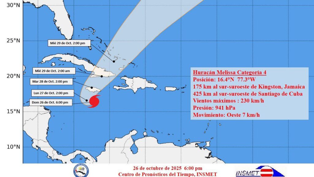 El huracán Melissa durante las últimas 12 horas ha continuado ganando ligeramente en intensidad. Los vientos máximos sostenidos aumentaron hasta 230 kilómetros por hora, con rachas superiores y su presión central descendió hasta 941 hectoPascal, por lo que se mantiene como un huracán categoría cuatro en la escala Saffir-Simpson.