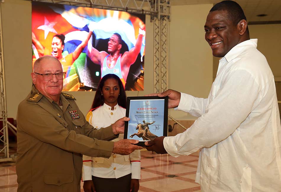 El pentacampeón olímpico Mijaín López y la 11 veces reina paralímpica Omara Durand recibieron la réplica del machete del Mayor General Antonio Maceo Grajales, de la mano del General de Cuerpo de Ejército Álvaro López Miera, ministro de las Fuerzas Armadas Revolucionarias (FAR).