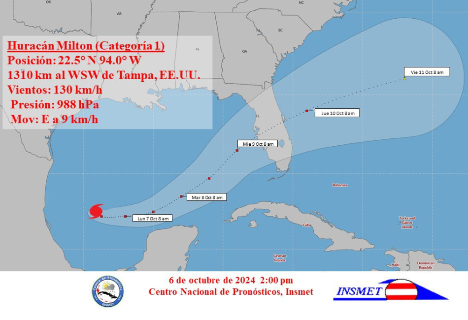 Debido a su posición actual y futura trayectoria al noreste por el golfo de México hacia la península de La Florida en las próximas 48 a 72 horas, el Centro de Pronósticos mantendrá una estrecha vigilancia sobre su evolución durante los próximos días.