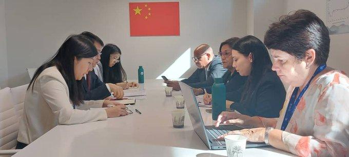 En el contexto de la XXVIII Conferencia de las Partes sobre Cambio Climático (COP28), la ministra de Ciencia Tecnología y Medio Ambiente de Cuba, Elba Rosa Pérez, diálogo este lunes con el viceministro de Ecología y Medio Ambiente de la República Popular China, Zhao Yingmin.