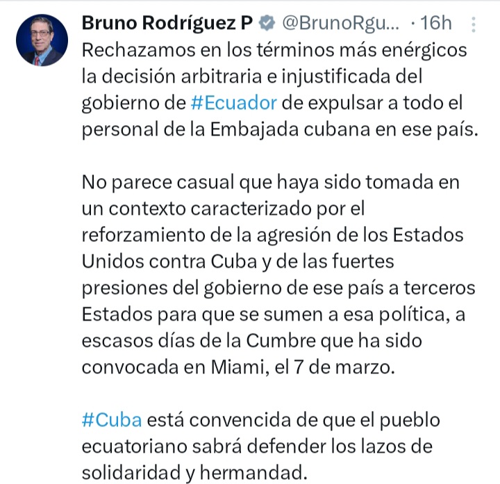 Ante la decisión tomada por el Gobierno del país sudamericano, el ministro de Relaciones Exteriores de Cuba, Bruno Rodríguez Parrilla, expuso en su red social X, que no parece casual que la decisión haya sido tomada en un contexto caracterizado por el reforzamiento de la agresión de los Estados Unidos contra Cuba y de las fuertes presiones del gobierno de ese país a terceros Estados para que se sumen a esa política.