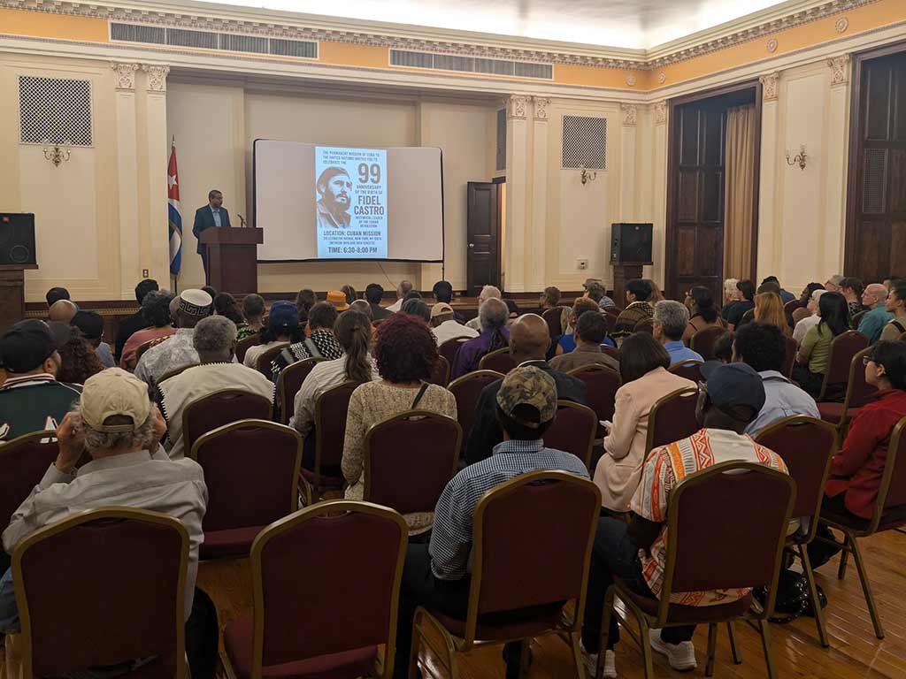 Representantes de diversas organizaciones solidarias de Estados Unidos rindieron homenaje al líder histórico de la Revolución cubana, Fidel Castro, en la Misión Permanente de Cuba en New York ante la ONU.