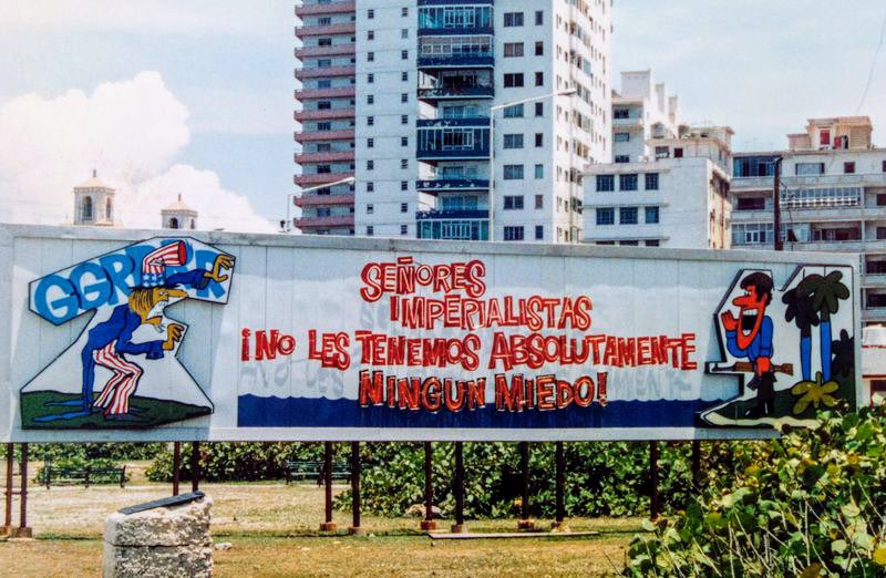 Durante muchos años, frente a lo que entonces era la Sección de Intereses de los Estados Unidos en La Habana, había un gran cartel a todo color donde un miliciano, fusil en mano, gritaba desde su isla de palmeras a un balbuceante Tío Sam: “Señores imperialistas no les tenemos absolutamente ningún miedo”.