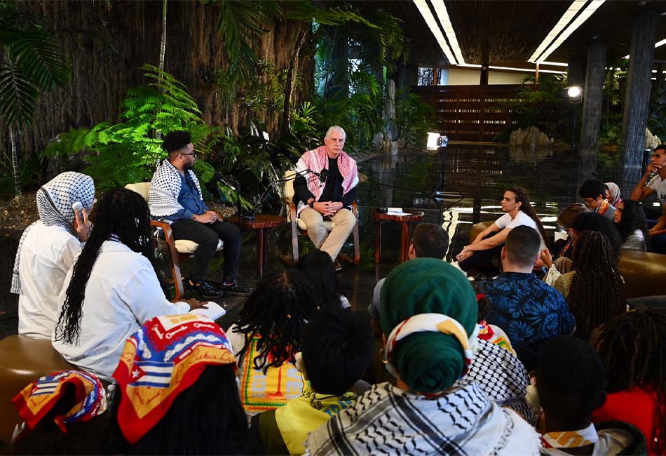 El presidente de la República de Cuba, Miguel Díaz-Canel Bermúdez, compartió con más de 100 jóvenes de la brigada estadounidense Let Cuba Live, de la Asamblea Internacional de los Pueblos, quienes realizan una visita solidaria con la causa de la mayor de las Antillas y de Palestina.