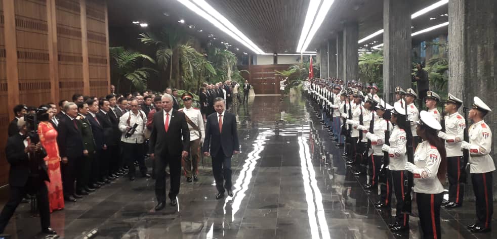Como es habitual en el acto de bienvenida ante un visitante de tan alta investidura fueron escuchados los himnos nacionales de Cuba y Vietnam y luego de pasar revista a la guardia de honor, los jefes de estado de ambos países presentaron a las respectivas delegaciones que los acompañan.