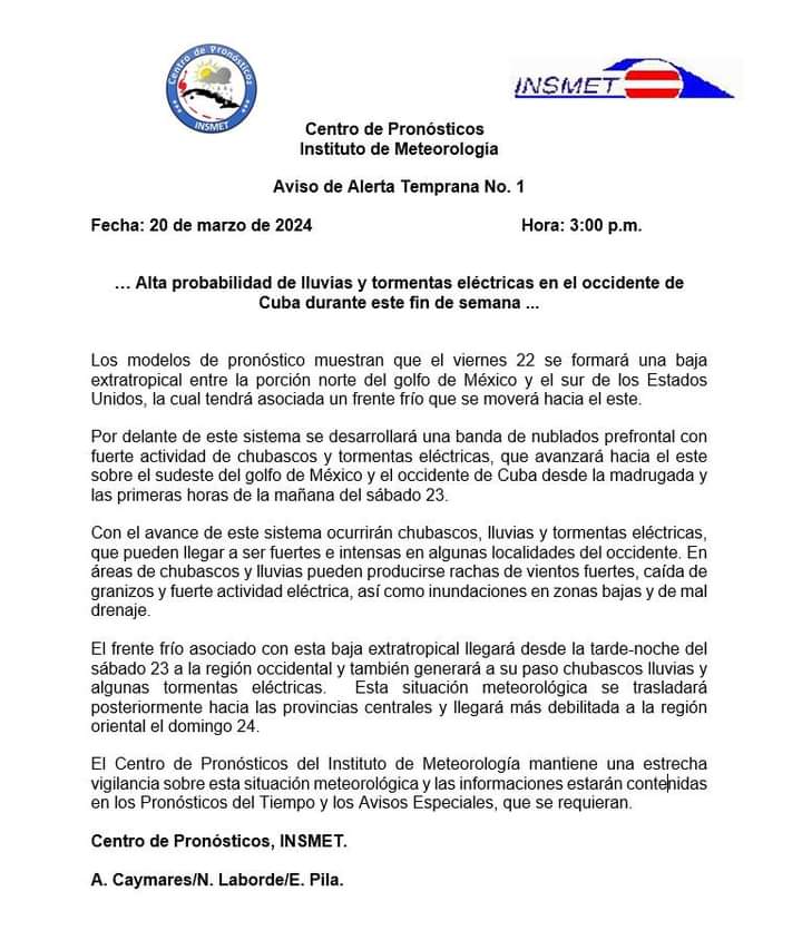El Centro de Pronósticos del Instituto de Meteorología mantiene una estrecha vigilancia sobre esta situación meteorológica y las informaciones estarán contenidas en los Pronósticos del Tiempo y los Avisos Especiales, que se requieran.