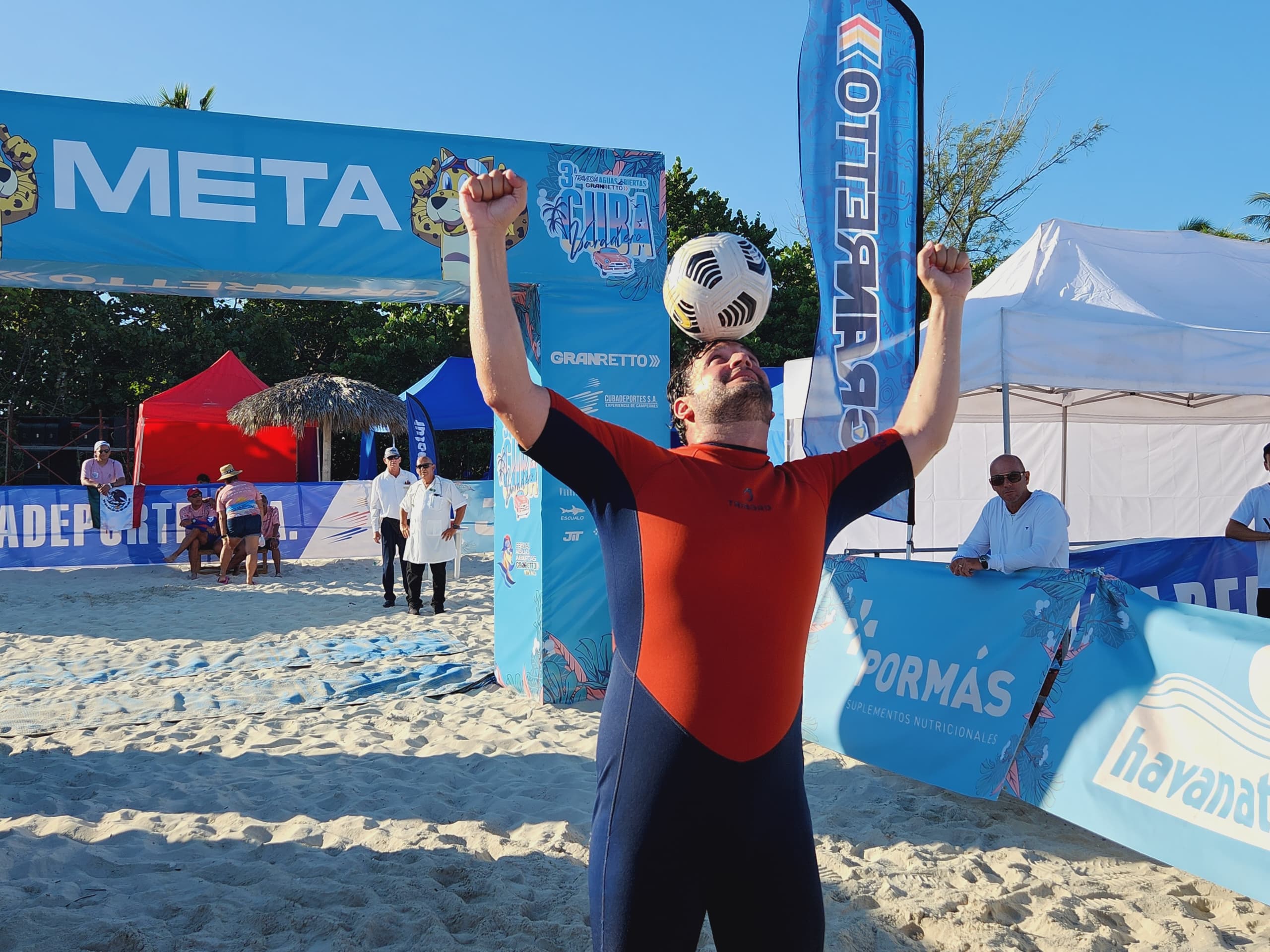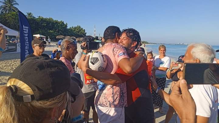 Luego de concretar la víspera un registro golpeando 172 veces el balón en una piscina con la cabeza durante un minuto, el natural de la provincia de Matanzas escogió las aguas del balneario de Varadero para recorrer 750 metros manteniendo la esférica en equilibrio sobre su testa en el en el marco de la III Travesía de Aguas Abiertas Gran Retto Cuba.
