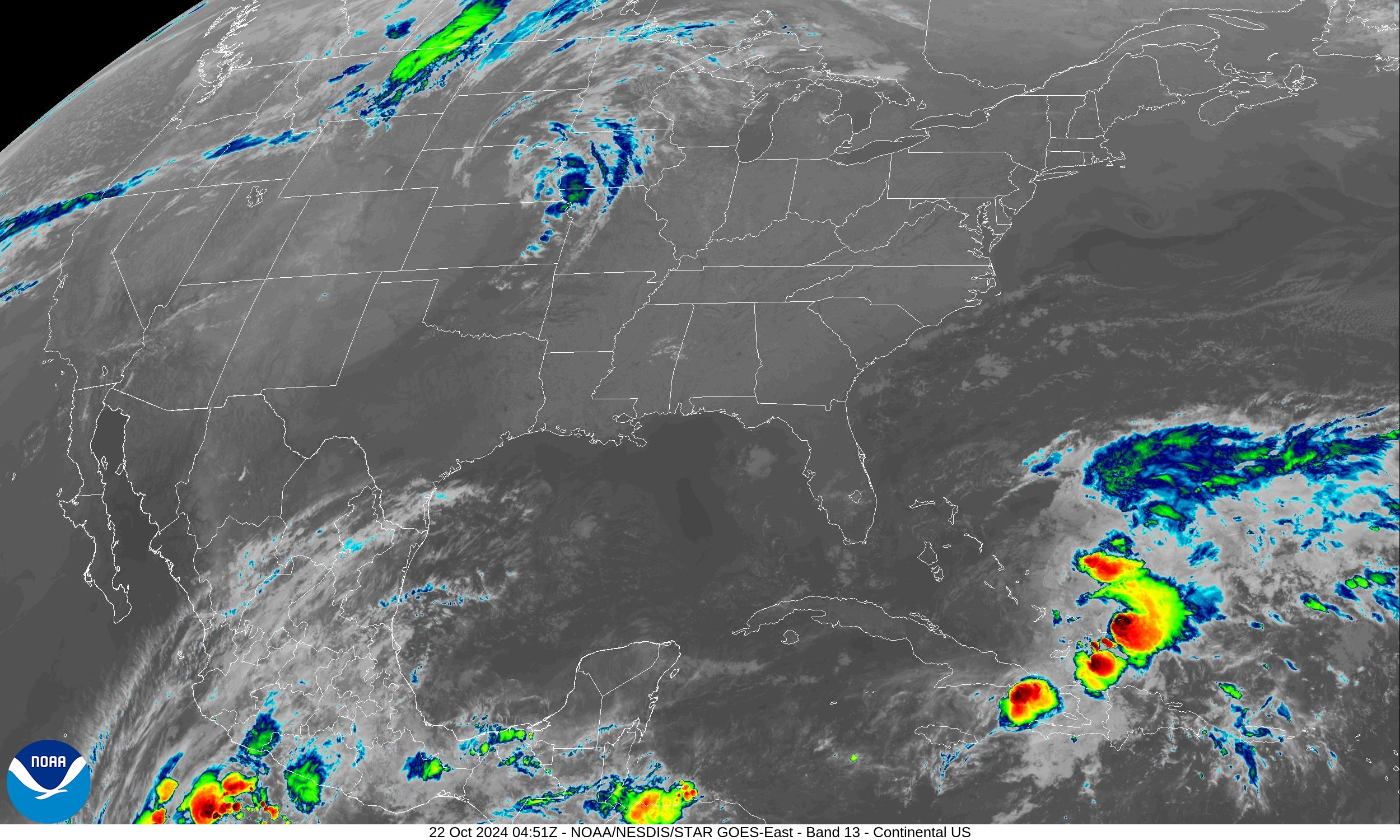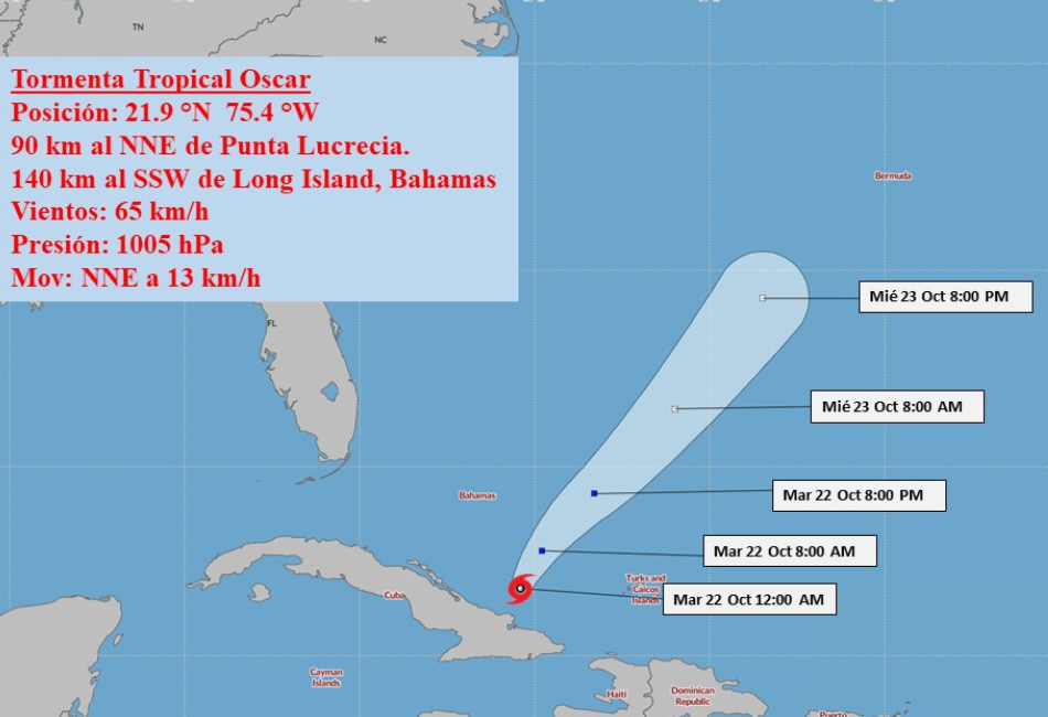 La tormenta tropical Oscar continúa alejándose del territorio nacional con poco cambio en intensidad. Tiene vientos máximos sostenidos de 65 kilómetros por hora, con rachas superiores y su presión mínima central es de 1005 hectopascal. Este sistema sigue con un rumbo próximo al norte-nordeste, incrementando su velocidad de traslación a 13 kilómetros por hora.