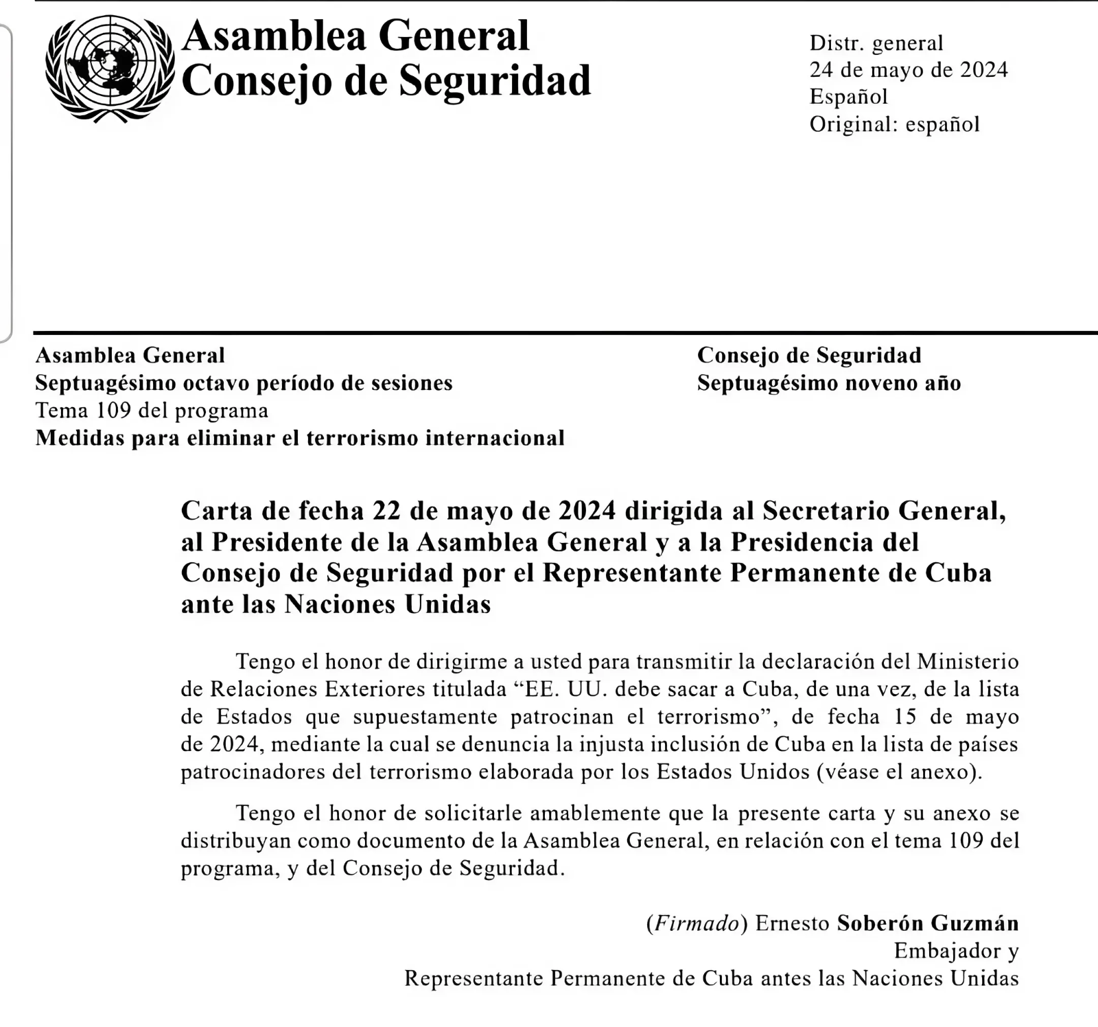 Tengo el honor de dirigirme a usted para trasmitir la declaración del Ministerio de Relaciones Exteriores titulada «EE.UU. debe sacar a Cuba, de una vez, de la lista de Estados que supuestamente patrocinan el terrorismo», de fecha 15 de mayo de 2024, mediante la cual se denuncia la injusta inclusión de Cuba en la lista de países patrocinadores del terrorismo elaborada por los Estados Unidos.