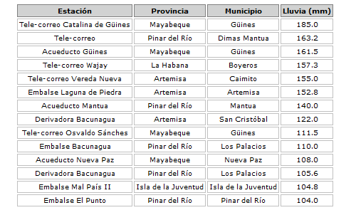 Durante las últimas veinticuatro horas se han reportado numerosas precipitaciones, chubascos y tormentas eléctricas en la región occidental, que llegaron a ser fuertes e intensas en algunas localidades de esta región. En La red de pluviómetros del Instituto Nacional de Recursos Hidráulicos reportó acumulados significativos superiores a los 100 milímetros en 14 localidades, de ellos 6 superan los 150 milímetros.