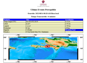 La red de Estaciones del Servicio Sismológico Nacional informó también un sismo en la noche de este viernes 13 de agosto de 2021 a las 8:47 pm y localizó un movimiento telúrico de magnitud de 3.6, en las coordenadas 19.73 grados de latitud norte y los -75.44 grados de longitud oeste, con una profundidad de 2.5 km.