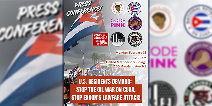 Residentes estadounidenses conscientes se congregarán cerca de la Corte Suprema de EE. UU. al mediodía del lunes 23 de febrero de 2026 en el Edificio Metodista Unido, ubicado en 100 Maryland Ave. NE, para denunciar y protestar contra el daño intencional que sufre el pueblo cubano como consecuencia de la agresión estadounidense disfrazada de política, incluidas las acciones de guerra jurídica presentadas ante la Corte Suprema por la empresa Exxon.